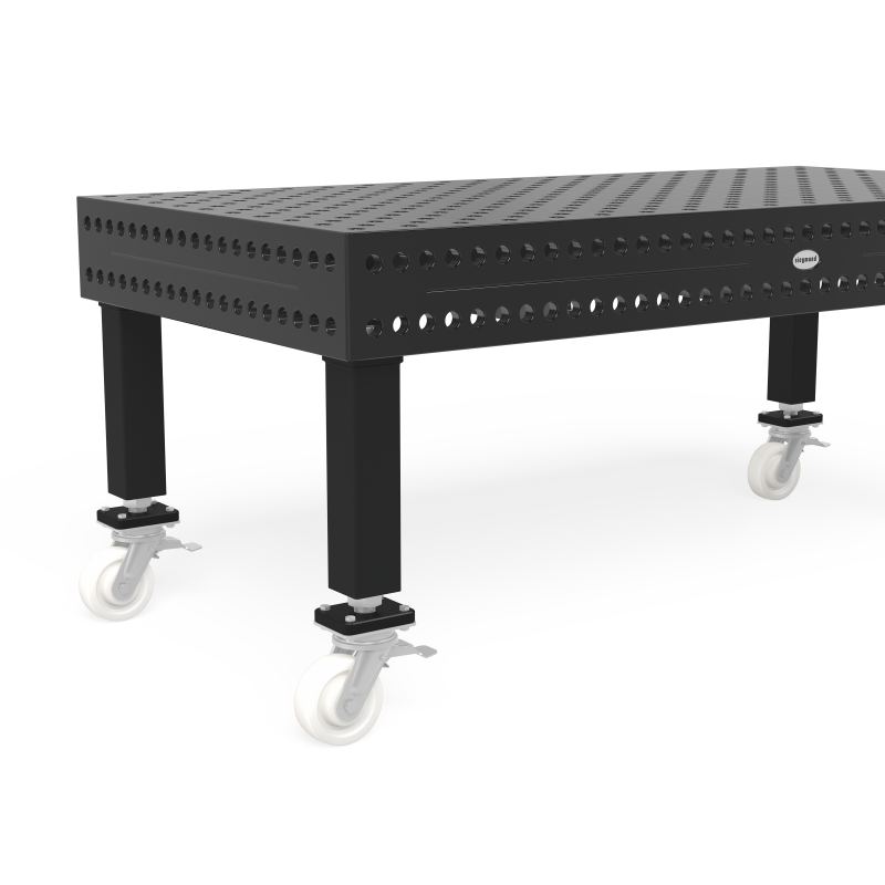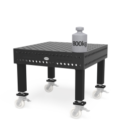Professional Extreme Table with diagonal hole arrangement on the table top and on the sides. The diameter of the boreholes is 28 mm, the material thickness is approx. 24,5-27 mm. The primary wear surface on the table’s top face is made of through-hardened tool steel. The four side faces are still constructed from our standard, high quality S355J2+N Steel to provide the ideal balance of properties for performance, durability, and cost. Grid lines spaced 100 mm apart simplify the set-up of your equipment.